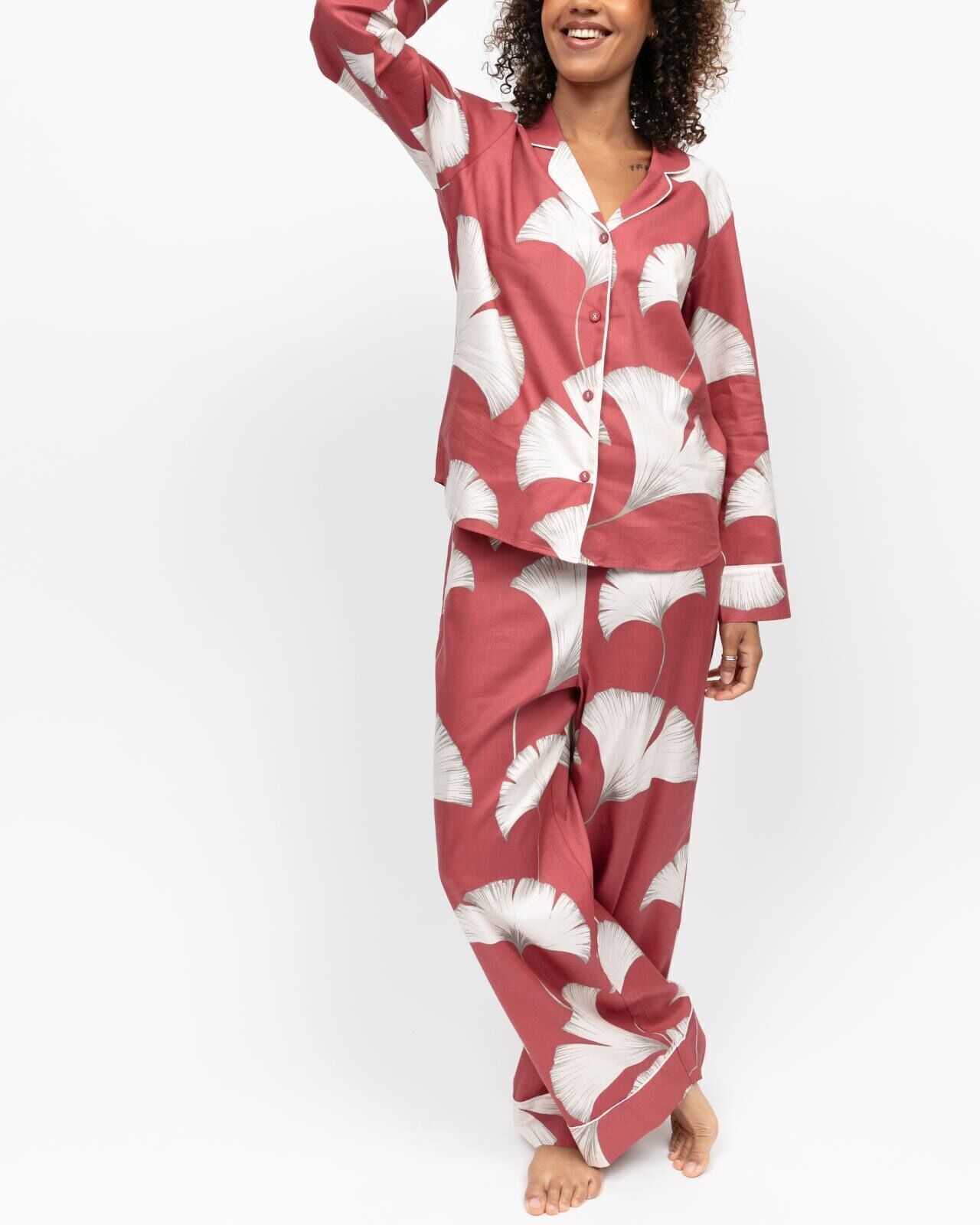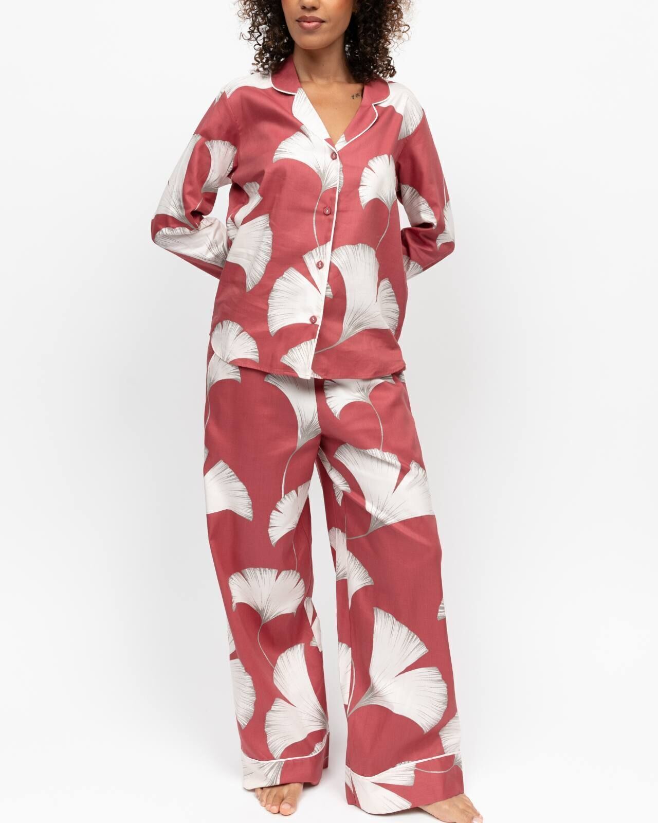 - A sophisticated palette of cream leaves over terracotta orange brings a sense of calm to your evening routine. This set is defined by its meticulous details: the long-sleeved top features a soft revere collar and tonal modal-covered buttons, while cream piping adds a tailored finish. Crafted from a breathable cotton-modal blend, the wide-leg bottoms and elasticated drawstring waist offer a bespoke-feeling fit that moves with you. It is the perfect marriage of structured elegance and downtime-ready softness.
