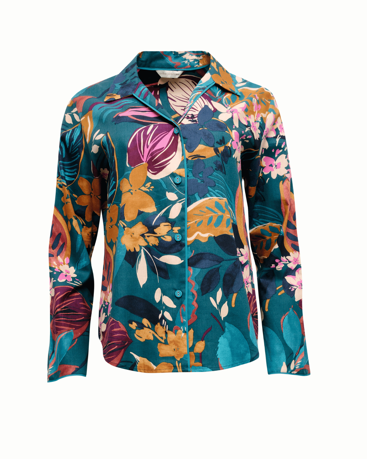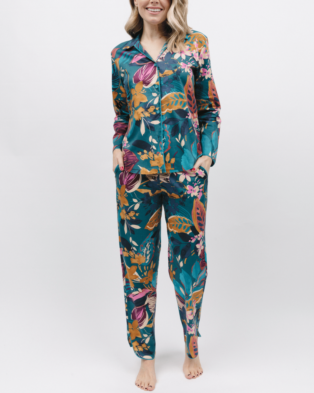- The leaf print adds a touch of elegance, while the light teal modal trim enhances the overall aesthetic. The pyjama top features a classic pointed collar and long sleeves for warmth and sophistication. It is fastened with luxurious light teal modal-covered buttons. The shaped bottom hem gives a polished look, even during leisure time. The pyjama bottoms provide unmatched comfort with an elasticated back waist and an adjustable front drawstring for a snug yet flexible fit. They also have convenient side pockets for keeping essentials close by. The flattering ankle splits add flair to the design, allowing for easy movement while maintaining an effortlessly stylish appearance. This pyjama set is not only a treat for yourself but also a perfect gift for a loved one.