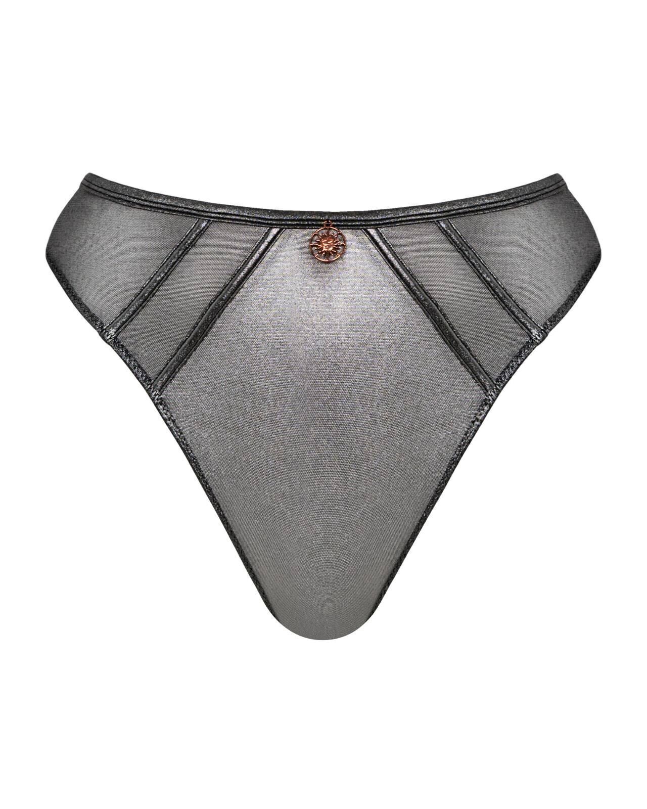 Paying homage to the goddess of the dawn, our Eos thong dazzles with silver foil printed detailing on black mesh. The finishing touch is the sun flare charm that adds that extra sprinkle of opulence.
