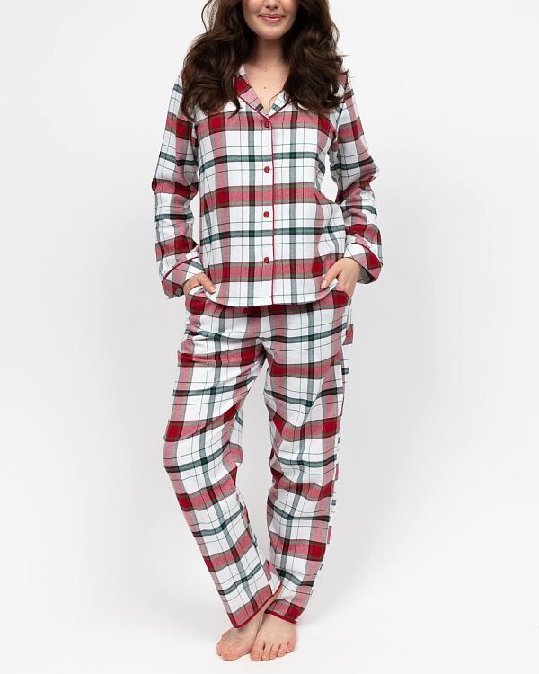 - The Blaze Brushed Check Long Sleeve Pyjama Set leans just enough into the festive season, whilst staying smart enough to wear well beyond it sheds its final layers. Made from 100% cotton, brushed for the kind of softness that’s hard to match, this pyjama set is sure to become a festive favourite. The red, green and white check print has that classic, cosy feel that begs to be worn on a full sofa. The top has a revere collar, cuffed sleeves, red modal piping and matching functional buttons, structured enough to look sharp, soft enough to fall asleep in. The bottoms follow suit with a clean flat front, elasticated back waist, adjustable drawstring and two side pockets. Whether you’re stepping into Christmas morning or settling in for a long winter evening, this set’s got you covered.