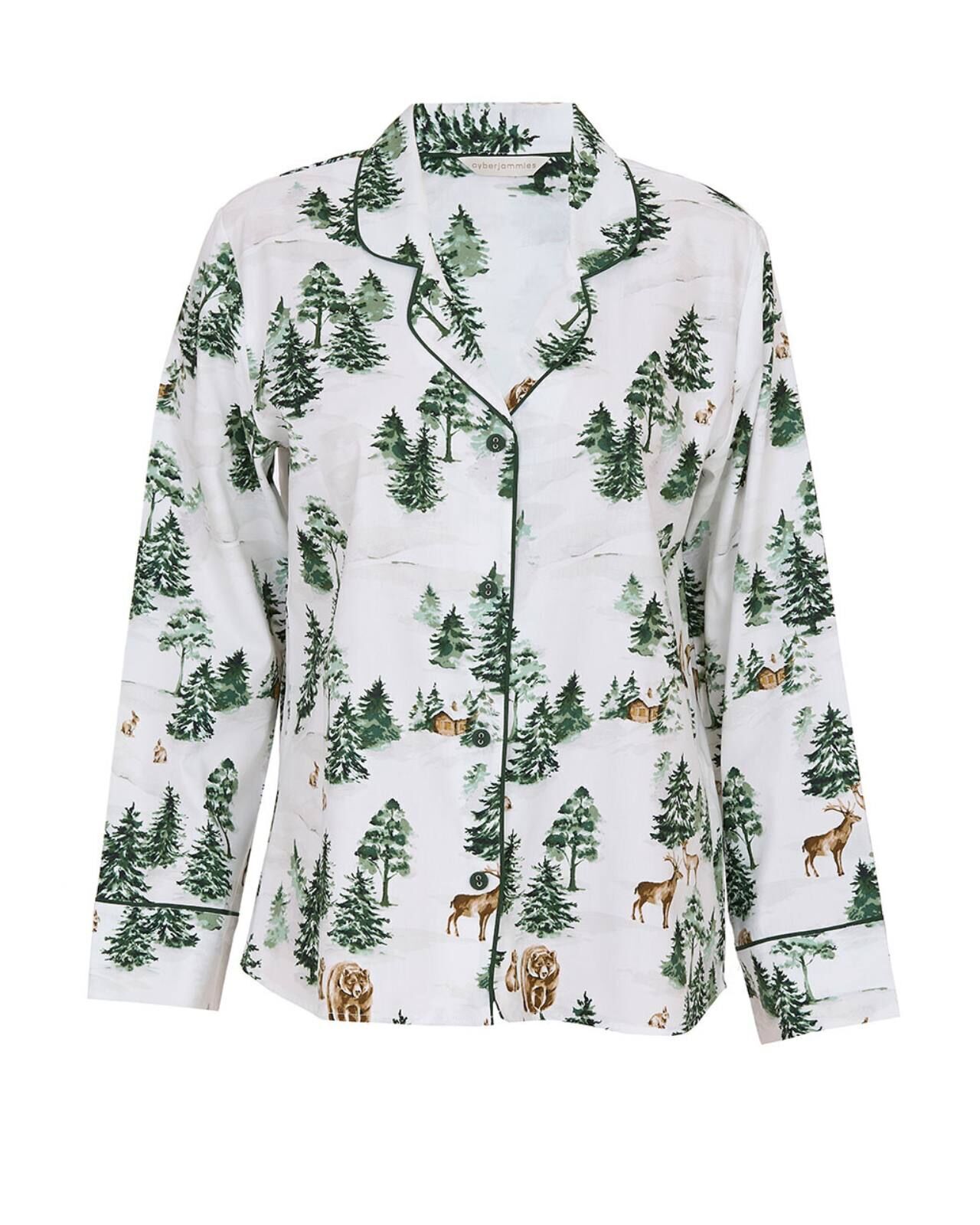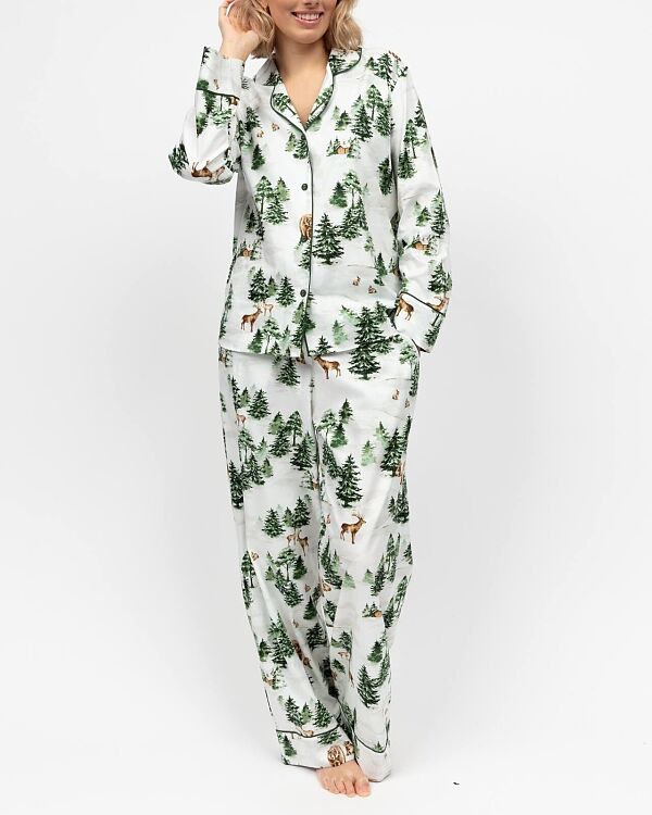 - Crafted in a super-soft blend of 60% cotton and 40% modal, this set feels gentle on the skin. With a serene alpine print of green pine trees, snow-dusted cabins, and woodland animals set against a clean white background, it brings the charm of a winter cabin getaway straight to your sleepwear drawer. The long-sleeved top features a revere collar, olive green functional modal-covered buttons, and matching modal piping to softly edge the opening, cuffs, and hems. The wide-leg pyjama bottoms are equally considered, trimmed in modal and designed with a flat front, elasticated back waistband, and adjustable drawstring for a personalised fit. Two side pockets and straight cuffed hems add functionality and flow, perfect for slow starts and long, lounging afternoons. Whether it’s for festive mornings, windowside evenings, or simply enjoying a weekend with no plans, this coordinated set delivers style, softness, and all the cosy feels the season calls for.