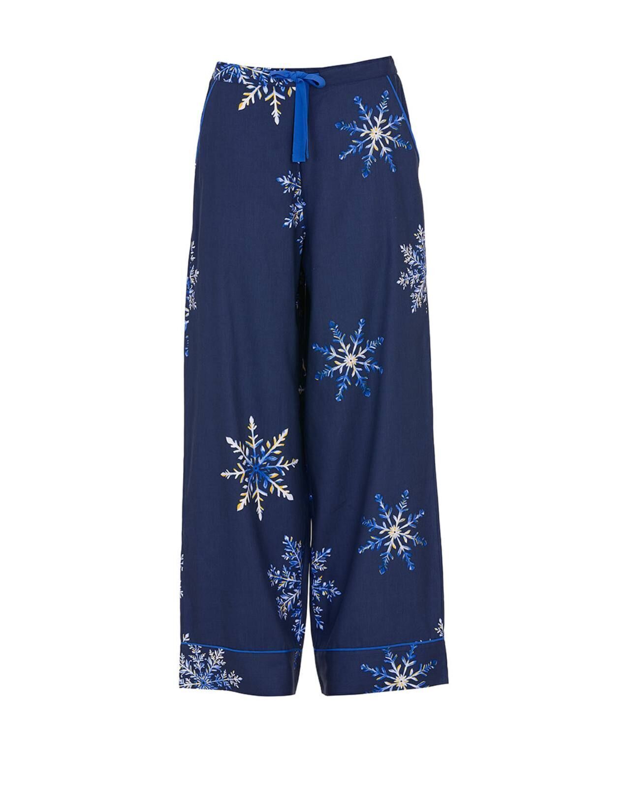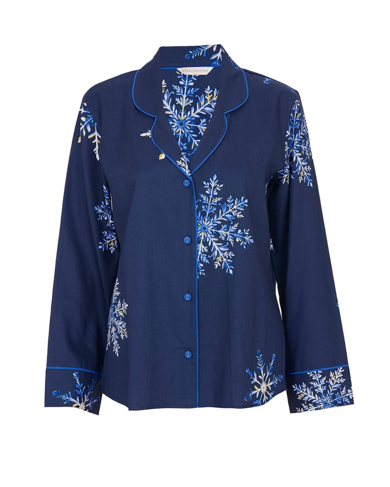 • With a print of scattered snowflakes falling gently across a deep navy backdrop, this matching pyjama set is all things peaceful and nostalgic, whilst staying playful enough to make staying in feel like something to look forward to. Crafted from a super-soft blend of 60% cotton and 40% modal, this set offers the kind of breathable warmth and smooth-on-the-skin feel that makes curling up under a blanket feel even more indulgent. The long sleeve top is designed with a revere collar, shaped hem, and functional blue modal-covered buttons, while the matching wide-leg bottoms feature an elasticated back waistband, an adjustable drawstring, and roomy side pockets for an effortlessly relaxed fit. Blue modal piping adds a subtle, wintry polish throughout - proof that even your cosiest pieces can still feel thoughtfully put together. For long nights, slow mornings, and every comforting moment in between, this is winter lounging, wrapped in its finest form. Both the top and bottoms are available for individual purchase, letting you mix and match sizes and styles as you wish.