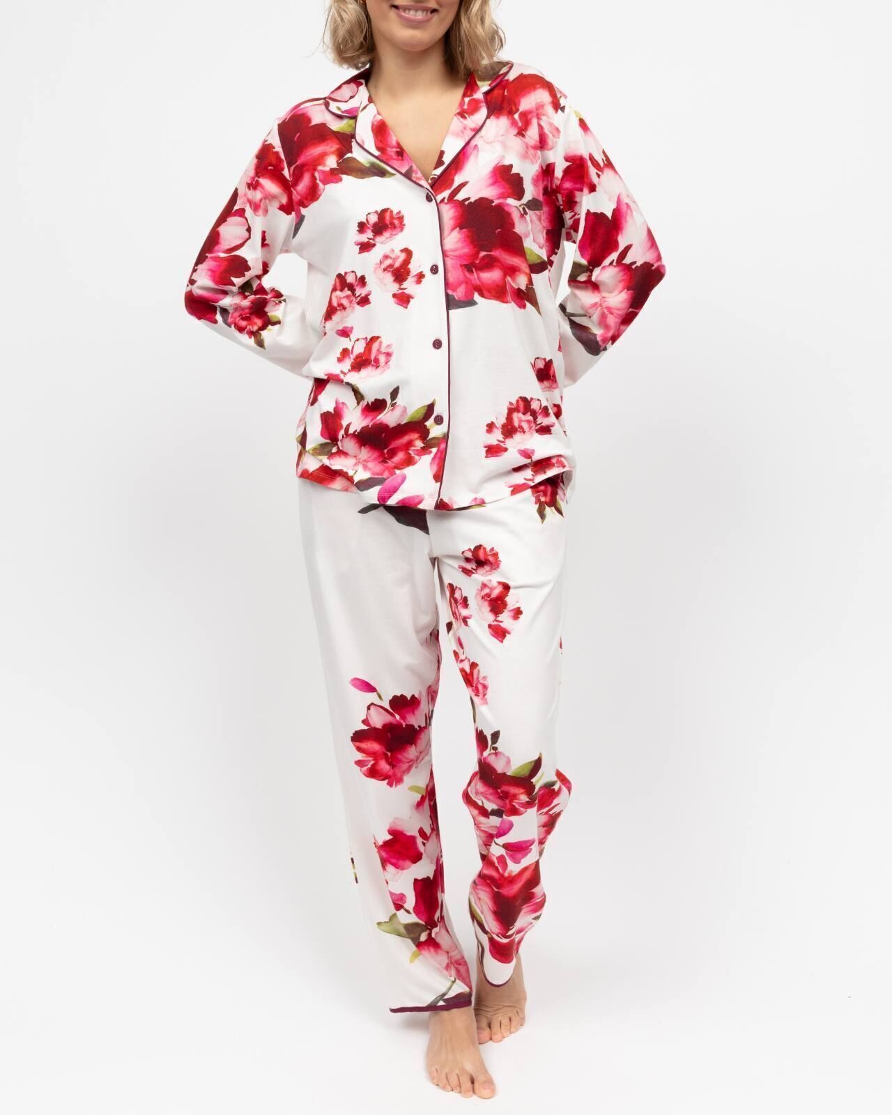 - It's why, no matter the time, the Isabella Oxblood Mix Floral Printed Jersey Long Sleeve Pyjama Set makes restful moments stretch on. Turning hurried mornings into slow ones and chaotic evenings into quiet ones. With a delicate scatter of red blooms set against fresh white jersey fabric, it's a set that's tailor made to make your downtime feel comfier. The long sleeve pyjama top features a classic revere collar and oxblood modal piping that traces along the seams and functional covered buttons, creating a tailored finish. The matching bottoms, with their easy elasticated waistband, drawstring tie, and side pockets, deliver equal on style and make wear easy, finely tuned for long spells on the sofa or weekend lie-ins with no alarms to think about. Both pieces are crafted in our super-soft jersey blend of cotton, modal and elastane, which has just the right balance of softness and stretch. And with thoughtful finishing touches throughout, this is a sleepwear set that doesn't need an occasion, it is the occasion.