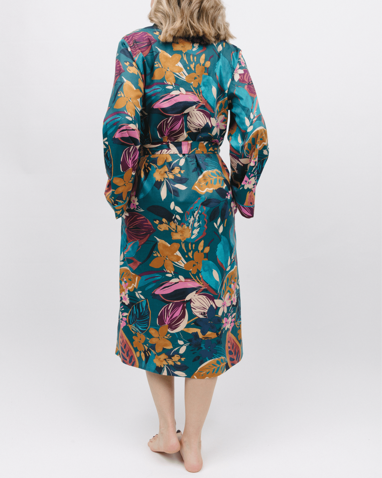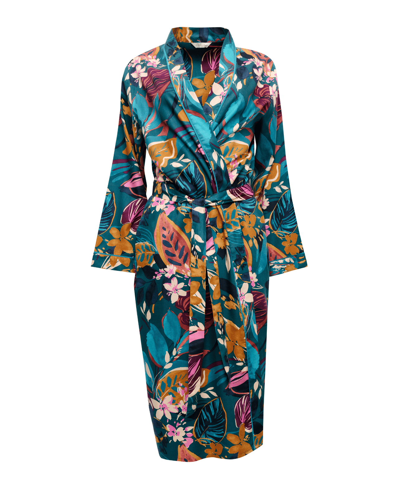 Indulge in the opulent comfort and elegance of the Maple teal leaf robe.