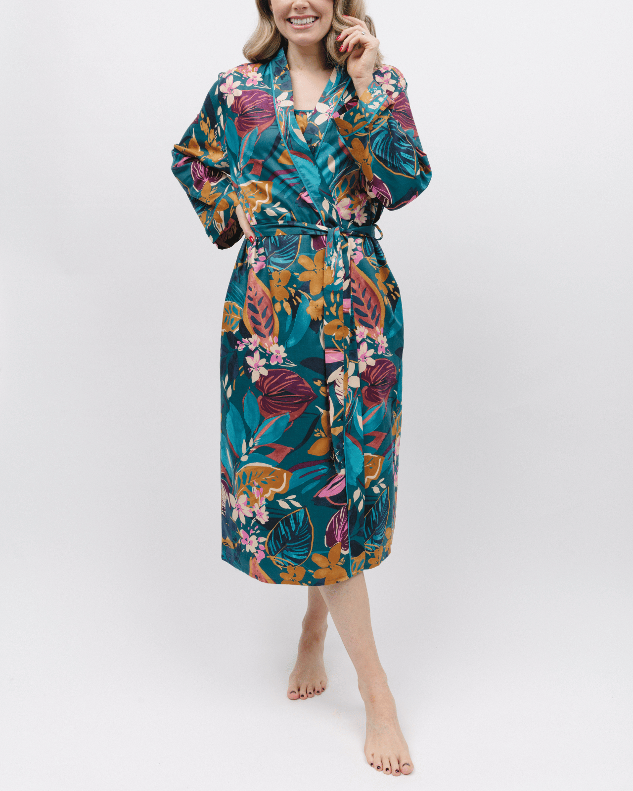 - Crafted from a heavenly blend of 60% cotton and 40% modal, this robe offers unparalleled softness and warmth for cooler evenings. The intricate leaf print, showcased against a rich teal background, is beautifully complemented by light teal modal trim. The wrap-front, kimono-style design adds a touch of sophistication, while the self-fabric belt ensures a snug and cozy fit. Complete with two convenient side pockets, our Maple autumnal leaf print robe is the perfect addition to your sleepwear collection. Whether you're lounging at home or preparing for bed, this robe guarantees both comfort and style.