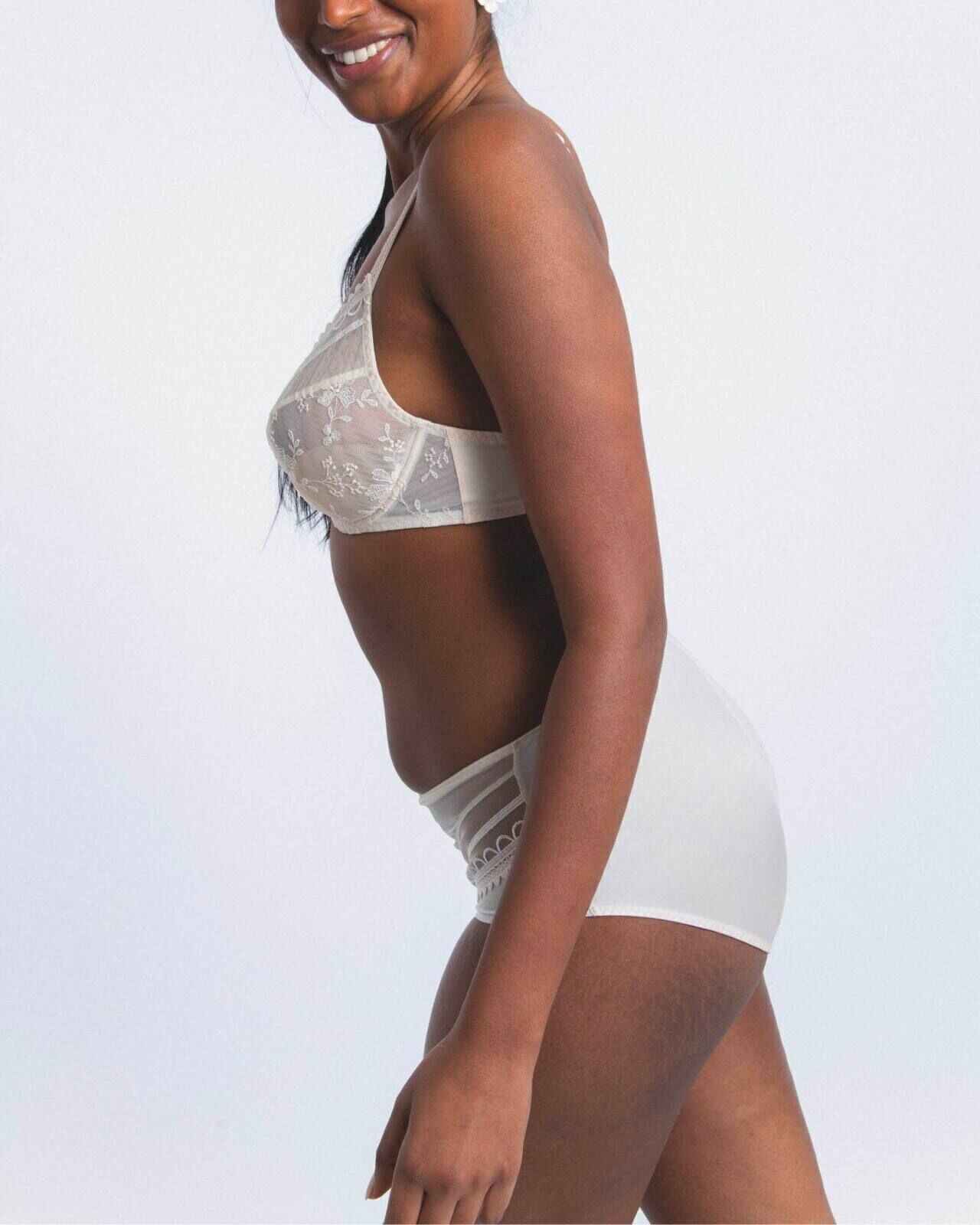 - This balconnet bra pairs delicate floral embroidery with robust underwire support, designed specifically for larger sizes up to an G cup. Its innovative 5-part construction ensures optimal lift and all-day comfort. The plunging neckline and enveloping shape create a flattering silhouette, while the beautiful floral details over satin mesh, lined with soft tulle, blend femininity with essential everyday wearability.